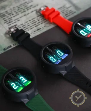 Eine Digital-Uhr mit einem markanten 57mm Auftritt am Handgelenk, gefertigt aus Harz mit einem Zifferblatt in schwarz und einer besonderen "glossy surface with exposed illuminated VFD (vacuum fluorescent) tubes"-Oberfläche.