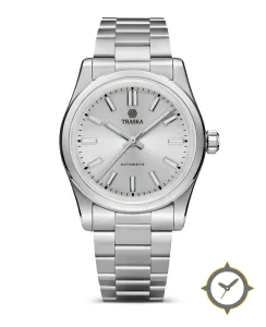 Eine Minimalistisch-Uhr mit einem vielseitigen 41mm Gehäuse, das an fast jedes Handgelenk passt, gefertigt aus Edelstahl mit einem Zifferblatt in weiß und einer besonderen "lacquer"-Oberfläche.