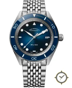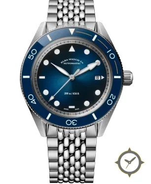 Eine Taucheruhr-Uhr mit einem 34.5mm Gehäuse im Vintage-Stil gefertigt aus Edelstahl mit einem Zifferblatt in blau und einer besonderen "sunburst"-Oberfläche.