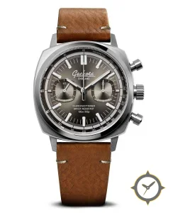 Eine Chronograph-Uhr mit einem vielseitigen 39mm Gehäuse, das an fast jedes Handgelenk passt, gefertigt aus Edelstahl mit einem Zifferblatt in braun und einer besonderen "sunburst / brushed gradient"-Oberfläche.