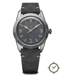Eine Vintage-Uhr mit einem 33.5mm Gehäuse im Vintage-Stil gefertigt aus Edelstahl mit einem Zifferblatt in blau und einer besonderen "grained/textured finish"-Oberfläche.