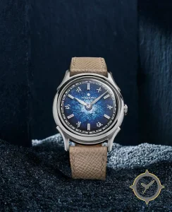 Eine Dress-Uhr mit einem 34.5mm Gehäuse im Vintage-Stil gefertigt aus Edelstahl mit einem Zifferblatt in blau und einer besonderen "textured enamel / granular finish"-Oberfläche.