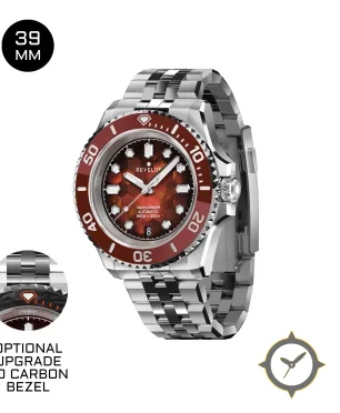 Eine Taucheruhr-Uhr mit einem vielseitigen 39mm Gehäuse, das an fast jedes Handgelenk passt, gefertigt aus Edelstahl mit einem Zifferblatt in rot und einer besonderen "hexagonal honeycomb texture with gradient depth"-Oberfläche.