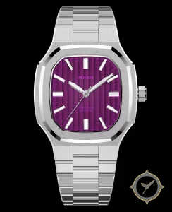 Eine Luxus-Uhr mit einem vielseitigen 40.5mm Gehäuse, das an fast jedes Handgelenk passt, gefertigt aus Edelstahl mit einem Zifferblatt in lila und einer besonderen "vertical fluted/striped texture"-Oberfläche.
