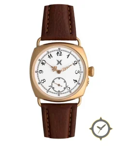 Eine Vintage-Uhr mit einem markanten 44mm Auftritt am Handgelenk, gefertigt aus Gold mit einem Zifferblatt in weiß und einer besonderen "enamel"-Oberfläche.