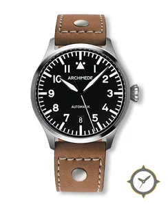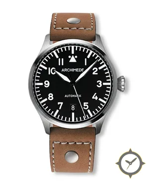 Eine Pilot-Uhr mit einem markanten 43.5mm Auftritt am Handgelenk, gefertigt aus Edelstahl mit einem Zifferblatt in schwarz und einer besonderen "matte"-Oberfläche.