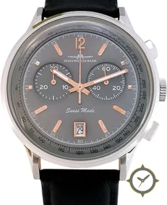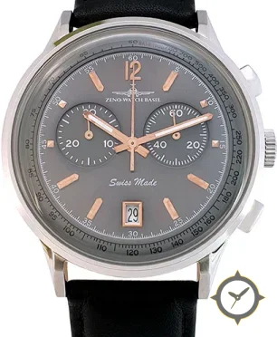 Eine Chronograph-Uhr gefertigt aus Edelstahl mit einem Zifferblatt in grau und einer besonderen "matte"-Oberfläche.
