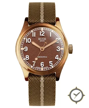 Eine Field-Uhr mit einem 37.5mm Gehäuse im Vintage-Stil gefertigt aus Bronze mit einem Zifferblatt in braun und einer besonderen "grained matte"-Oberfläche.