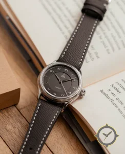 Eine Dress-Uhr mit einem markanten 43mm Auftritt am Handgelenk, gefertigt aus Edelstahl mit einem Zifferblatt in grau und einer besonderen "matte"-Oberfläche.