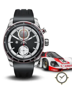 Eine Racing-Uhr mit einem markanten 45.5mm Auftritt am Handgelenk, gefertigt aus Edelstahl mit einem Zifferblatt in schwarz und einer besonderen "textured honeycomb/mesh"-Oberfläche und einer echten GMT-Funktion, mit der du eine zweite Zeitzone verfolgen kannst.