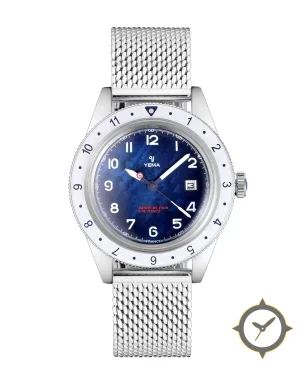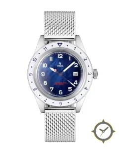 Eine Luftfahrt-Uhr mit einem 35mm Gehäuse im Vintage-Stil gefertigt aus Edelstahl mit einem Zifferblatt in blau und einer besonderen "marbled/variegated (cloudy) finish"-Oberfläche.