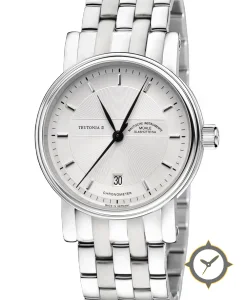 Eine Dress-Uhr mit einem markanten 46mm Auftritt am Handgelenk, gefertigt aus Edelstahl mit einem Zifferblatt in weiß und einer besonderen "concentric guilloche"-Oberfläche.