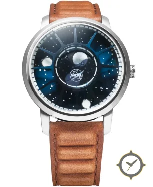 Eine Minimalistisch-Uhr mit einem markanten 42mm Auftritt am Handgelenk, gefertigt aus Edelstahl mit einem Zifferblatt in marineblau und einer besonderen "starfield with radial gradient"-Oberfläche und einer wunderschönen Mondphasenanzeige.