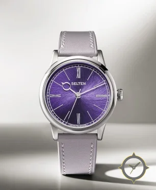 Eine Dress-Uhr mit einem markanten 44mm Auftritt am Handgelenk, gefertigt aus Edelstahl mit einem Zifferblatt in lila und einer besonderen "grand-feu enamel, sunburst finish"-Oberfläche.