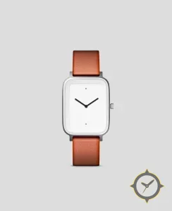 Eine Minimalistisch-Uhr mit einem markanten 43.5mm Auftritt am Handgelenk, gefertigt aus Edelstahl mit einem Zifferblatt in weiß und einer besonderen "matte"-Oberfläche.