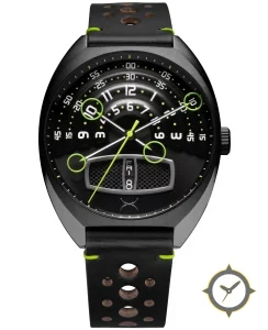 Eine Racing-Uhr mit einem vielseitigen 38mm Gehäuse, das an fast jedes Handgelenk passt, gefertigt aus Edelstahl mit einem Zifferblatt in schwarz und einer besonderen "concentric stepped rings with matte finish"-Oberfläche.