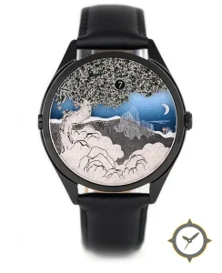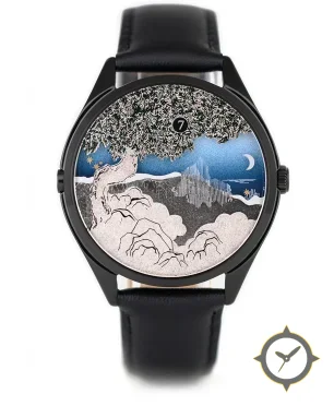 Eine Dress-Uhr mit einem vielseitigen 38mm Gehäuse, das an fast jedes Handgelenk passt, gefertigt aus Edelstahl mit einem Zifferblatt in blau und einer besonderen "engraved/textured metallic landscape illustration"-Oberfläche.