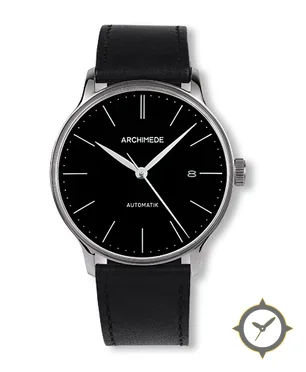 Eine Dress-Uhr mit einem markanten 44mm Auftritt am Handgelenk, gefertigt aus Edelstahl mit einem Zifferblatt in schwarz und einer besonderen "matte"-Oberfläche.