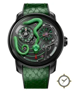 Eine Skelett-Uhr mit einem markanten 43.5mm Auftritt am Handgelenk, gefertigt aus Edelstahl mit einem Zifferblatt in schwarz und einer besonderen "open-work / skeletonized with visible gears and polished accents"-Oberfläche.