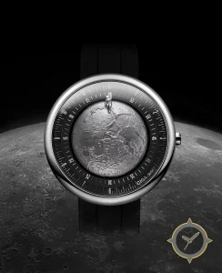 Eine Minimalistisch-Uhr gefertigt aus Edelstahl mit einem Zifferblatt in grau und einer besonderen "textured relief (cratered moon surface)"-Oberfläche und einer wunderschönen Mondphasenanzeige.