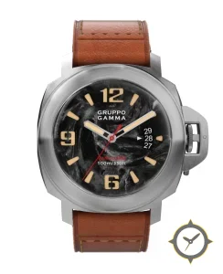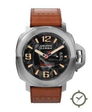 Eine Vintage-Uhr mit einem markanten 45.5mm Auftritt am Handgelenk, gefertigt aus Edelstahl mit einem Zifferblatt in schwarz und einer besonderen "marbled/swirl"-Oberfläche.