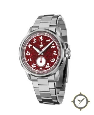 Eine Luxus-Uhr mit einem markanten 44.5mm Auftritt am Handgelenk, gefertigt aus Edelstahl mit einem Zifferblatt in rot und einer besonderen "glitter / sparkling"-Oberfläche.