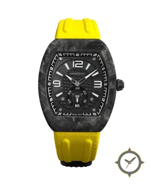 Eine Sport-Uhr gefertigt aus Carbon mit einem Zifferblatt in schwarz und einer besonderen "carbon-fiber (woven)"-Oberfläche.