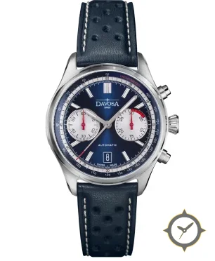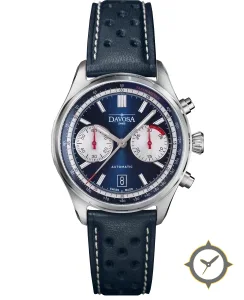Eine Chronograph-Uhr mit einem markanten 43.5mm Auftritt am Handgelenk, gefertigt aus Edelstahl mit einem Zifferblatt in blau und einer besonderen "sunburst"-Oberfläche.