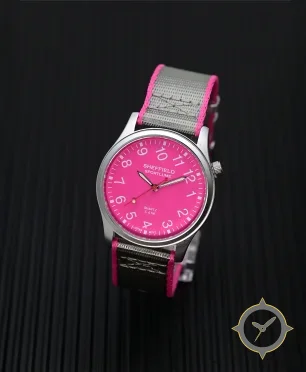 Eine Field-Uhr mit einem 34mm Gehäuse im Vintage-Stil gefertigt aus Edelstahl mit einem Zifferblatt in rot und einer besonderen "matte"-Oberfläche.