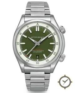 Eine Taucheruhr-Uhr mit einem markanten 41.5mm Auftritt am Handgelenk, gefertigt aus Edelstahl mit einem Zifferblatt in grün und einer besonderen "matte"-Oberfläche.