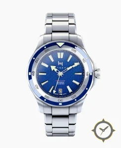 Eine Taucheruhr-Uhr mit einem 37.5mm Gehäuse im Vintage-Stil gefertigt aus Edelstahl mit einem Zifferblatt in blau und einer besonderen "textured woven/geometric finish"-Oberfläche.