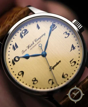 Eine Dress-Uhr mit einem 36mm Gehäuse im Vintage-Stil gefertigt aus Edelstahl mit einem Zifferblatt in gold und einer besonderen "vertical brushed (hairline)"-Oberfläche.
