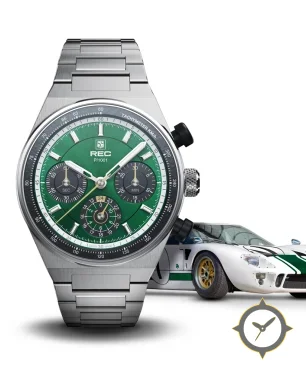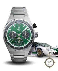 Eine Racing-Uhr mit einem vielseitigen 40.5mm Gehäuse, das an fast jedes Handgelenk passt, gefertigt aus Edelstahl mit einem Zifferblatt in grün und einer besonderen "sunburst (brushed)"-Oberfläche und einer echten GMT-Funktion, mit der du eine zweite Zeitzone verfolgen kannst.