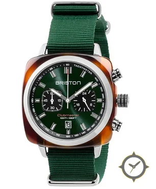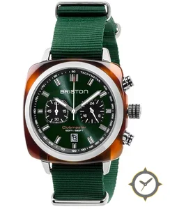 Eine Chronograph-Uhr mit einem vielseitigen 39.5mm Gehäuse, das an fast jedes Handgelenk passt, gefertigt aus Harz mit einem Zifferblatt in grün und einer besonderen "sunburst"-Oberfläche.