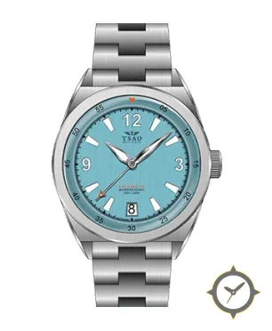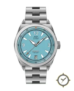 Eine Taucheruhr-Uhr mit einem 33mm Gehäuse im Vintage-Stil gefertigt aus Edelstahl mit einem Zifferblatt in türkis und einer besonderen "brushed vertical"-Oberfläche.
