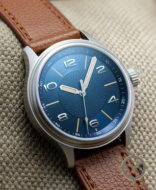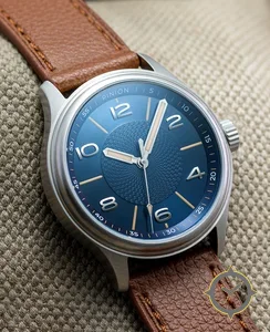 Eine Field-Uhr mit einem 33mm Gehäuse im Vintage-Stil gefertigt aus Edelstahl mit einem Zifferblatt in blau und einer besonderen "sunburst outer with guilloché (textured) central disk"-Oberfläche.