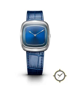 Eine Dress-Uhr mit einem 36mm Gehäuse im Vintage-Stil gefertigt aus Edelstahl mit einem Zifferblatt in blau und einer besonderen "sunburst (sunray) finish"-Oberfläche.