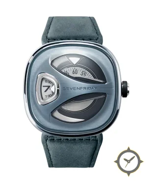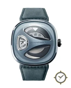 Eine Skelett-Uhr mit einem markanten 44.5mm Auftritt am Handgelenk, gefertigt aus Edelstahl mit einem Zifferblatt in blau und einer besonderen "brushed-metal"-Oberfläche.