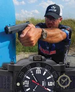 Eine Taktisch-Uhr mit einem markanten 48.5mm Auftritt am Handgelenk, gefertigt aus Harz mit einem Zifferblatt in schwarz und einer besonderen "matte"-Oberfläche.
