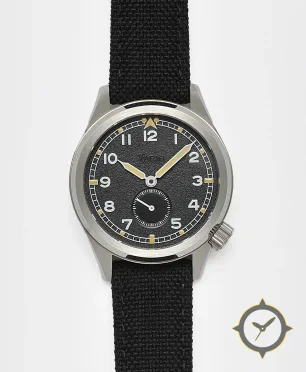 Eine Field-Uhr mit einem vielseitigen 38mm Gehäuse, das an fast jedes Handgelenk passt, gefertigt aus Edelstahl mit einem Zifferblatt in schwarz und einer besonderen "grained/textured finish"-Oberfläche.