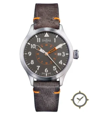 Eine Pilot-Uhr mit einem vielseitigen 38.5mm Gehäuse, das an fast jedes Handgelenk passt, gefertigt aus Edelstahl mit einem Zifferblatt in grau und einer besonderen "matte"-Oberfläche.
