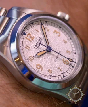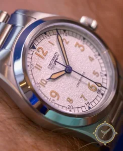 Eine Field-Uhr mit einem 34mm Gehäuse im Vintage-Stil gefertigt aus Edelstahl mit einem Zifferblatt in weiß und einer besonderen "textured/grained (pebble-like)"-Oberfläche.