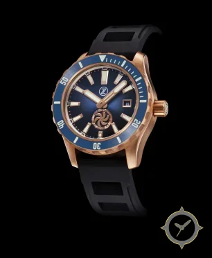 Eine Taucheruhr-Uhr mit einem markanten 44.5mm Auftritt am Handgelenk, gefertigt aus Bronze mit einem Zifferblatt in blau und einer besonderen "sunburst (radial brushed)"-Oberfläche.