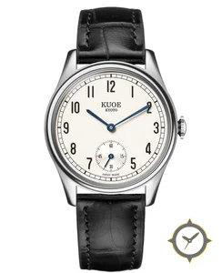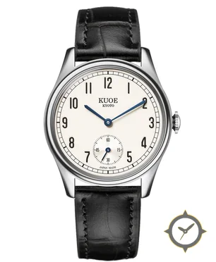 Eine Dress-Uhr mit einem 35.5mm Gehäuse im Vintage-Stil gefertigt aus Edelstahl mit einem Zifferblatt in weiß und einer besonderen "lacquered/smooth"-Oberfläche.