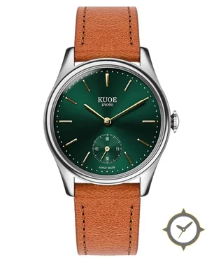Eine Dress-Uhr mit einem markanten 42mm Auftritt am Handgelenk, gefertigt aus Edelstahl mit einem Zifferblatt in grün und einer besonderen "sunburst (radial gradient)"-Oberfläche.