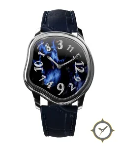 Eine Luxus-Uhr gefertigt aus Edelstahl mit einem Zifferblatt in blau und einer besonderen "marbled / agate-like with flame streaks"-Oberfläche.