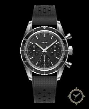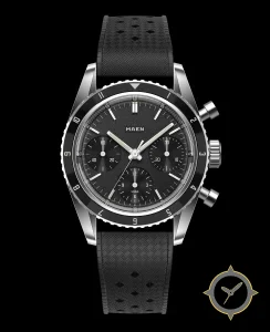 Eine Chronograph-Uhr mit einem 31.5mm Gehäuse im Vintage-Stil gefertigt aus Edelstahl mit einem Zifferblatt in schwarz und einer besonderen "textured/grained (sandblasted)"-Oberfläche.