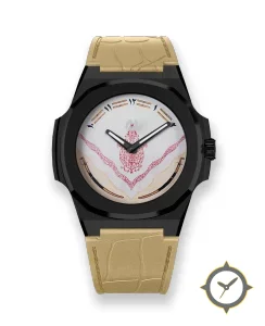 Eine Luxus-Uhr mit einem vielseitigen 40mm Gehäuse, das an fast jedes Handgelenk passt, gefertigt aus Beschichtung mit einem Zifferblatt in weiß und einer besonderen "textured/grainy matte surface with printed detailing"-Oberfläche.