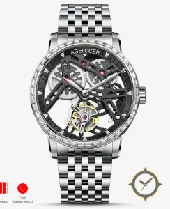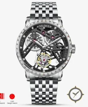 Eine Skelett-Uhr mit einem 37.5mm Gehäuse im Vintage-Stil gefertigt aus Edelstahl mit einem Zifferblatt in schwarz und einer besonderen "open-worked (skeletonized)"-Oberfläche.