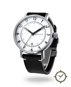Eine Minimalistisch-Uhr mit einem markanten 44.5mm Auftritt am Handgelenk, gefertigt aus Edelstahl mit einem Zifferblatt in weiß und einer besonderen "matte"-Oberfläche.